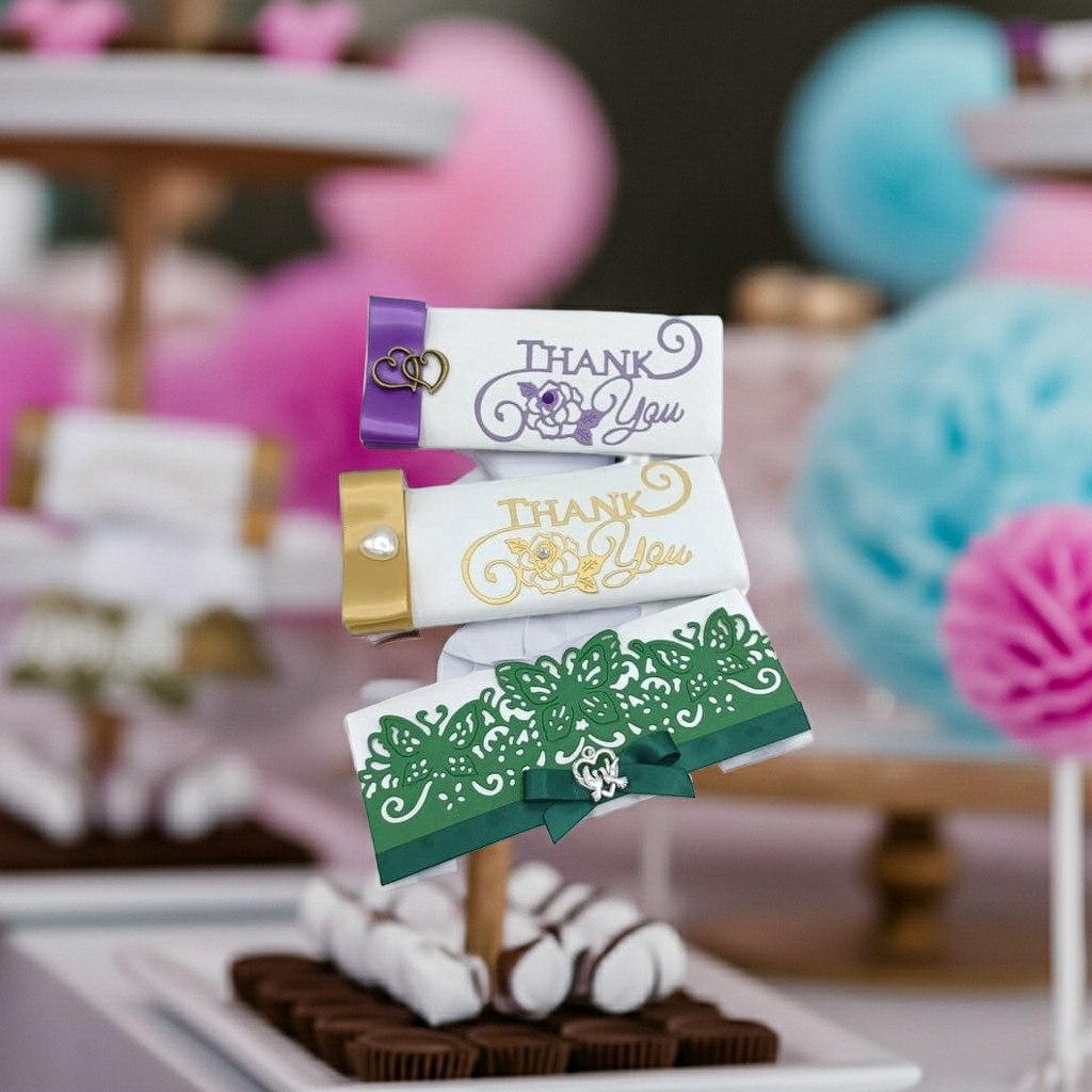 These Wedding Chocolate Wrappers are handmade. Such an elegant packaging of chocolate can be presented to guests
