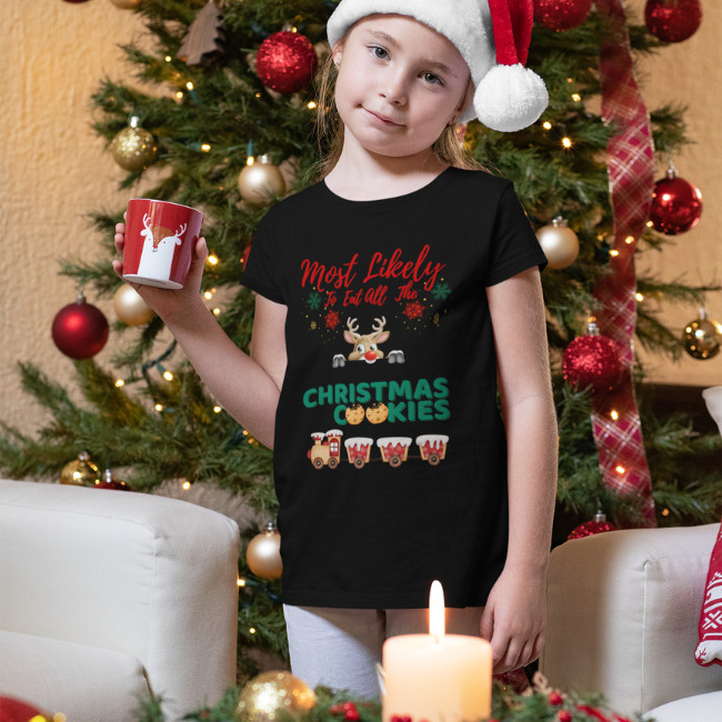 Get ready for holiday laughter with this funny Christmas Cookies PNG design featuring the playful quote “Most Likely to Eat All the Cookies.” The artwork shows cute festive cookies and holiday details, perfect for kids, families, or cookie lovers who can’t resist Christmas treats!